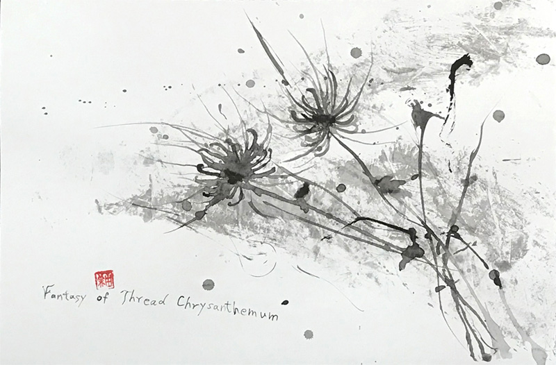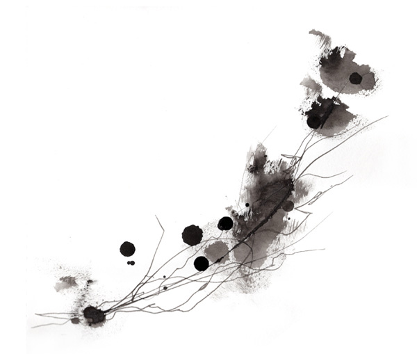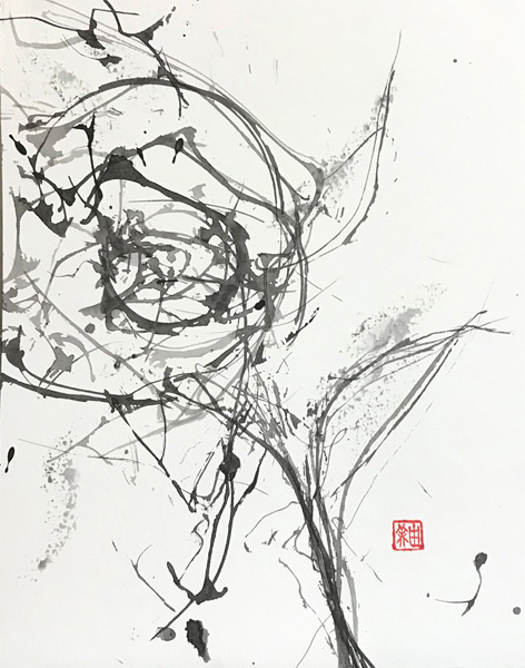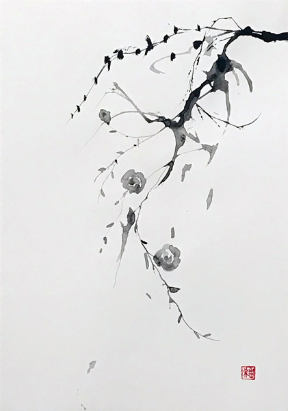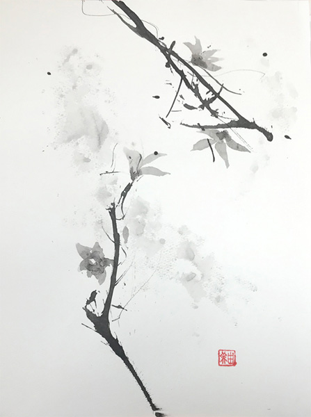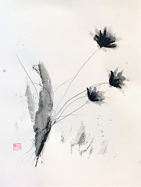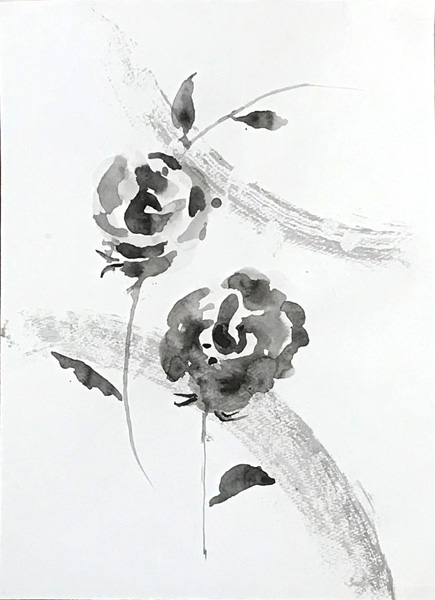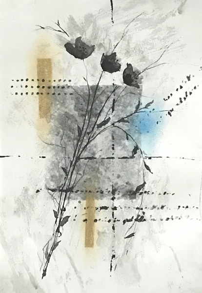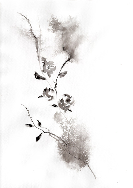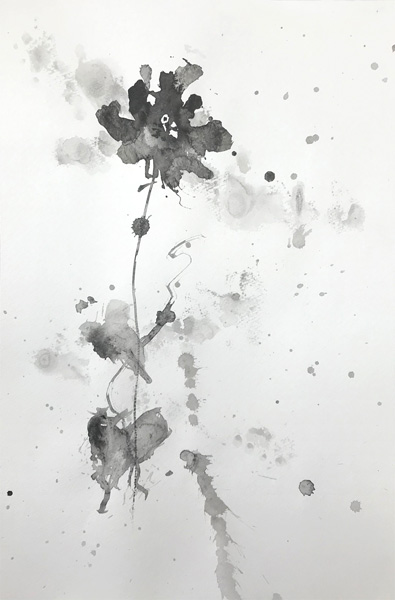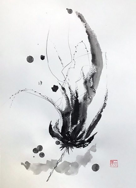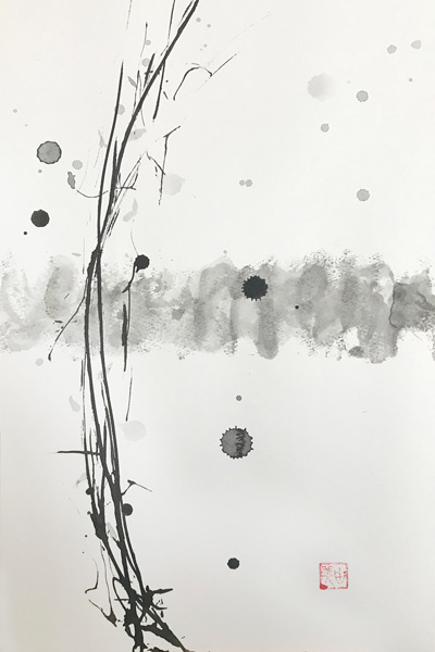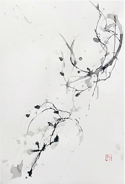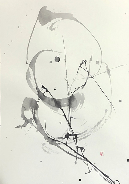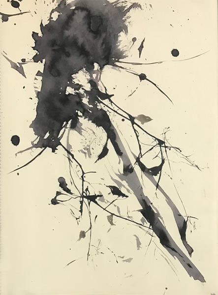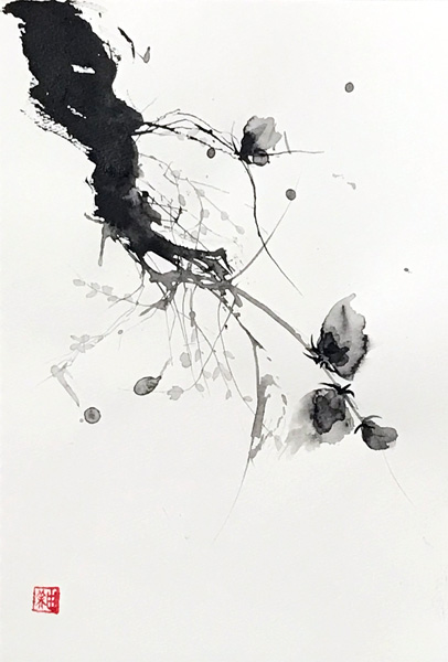 2021年頃から、墨を使用した作品制作に力を入れるようになりました。私の墨作品は、いわゆる「水墨画」とは一線を画しています。 基礎知識として、それらの手法はひととおり知っていますが、伝統的な描き方はとりあえず横に置いて、自分の手法を模索しています。 ですので、普通水墨画には使わない、ペンや木炭といったアイテムも時には用いています。また、水彩と同様、自身が編み出した独特のカスレを生む特殊技法も 作品によっては使用しています。